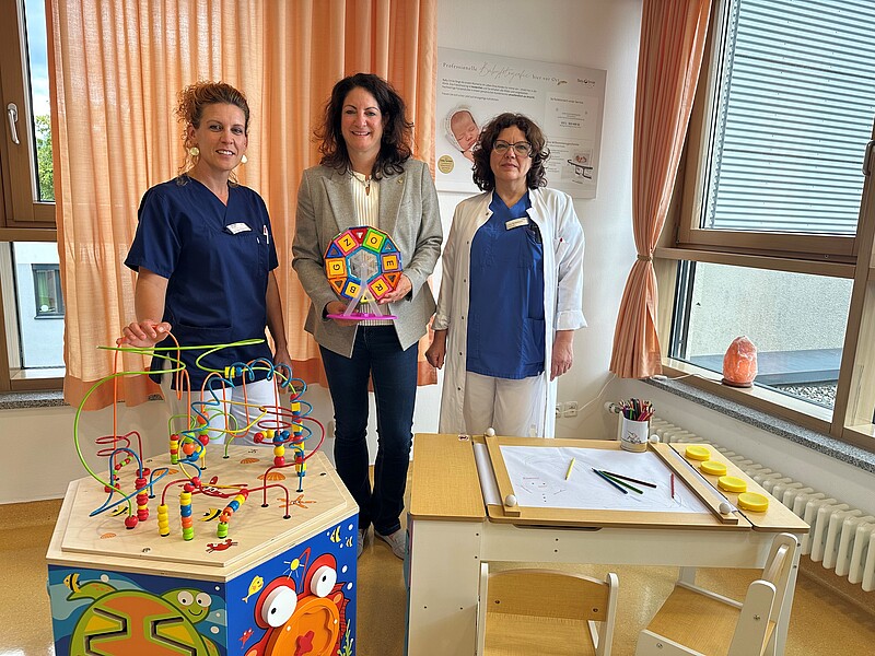 ERBACH. Über eine Spende in Höhe von 1.200 Euro aus dem Erlös des Adventskonzerts 2024 in der Erbacher Stadtkirche freut sich die Geburtshilfe des Gesundheitszentrums Odenwaldkreis (GZO). Bei einem Termin auf der Entbindungsstation überreichte Andrea Kruse vom Rotary Club Erbach-Michelstadt an Oberärztin Inna Bespalova (in Vertretung von Chefärztin Dr. Julia Mann) und Stationsleitung Sandra Rapp die neu angeschafften Gegenstände: ein Magnetspielzeug, eine Kindersitzgruppe und einen Motoriktisch für die neue interaktive Kinderecke sowie ein Affirmationsposter, außerdem Balancekissen für die Rückbildungs- und Beckenbodenkurse der Elternakademie sowie eine Muttermundschablone und einen Sessel für den Kreißsaal.