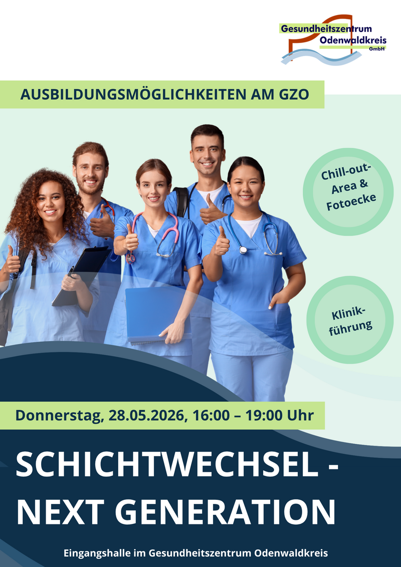 Am 28. Mai 2026 öffnet das Gesundheitszentrum Odenwaldkreis (GZO) von 16:00 bis 19:00 Uhr ihre Türen für den Azubi-Abend „Schichtwechsel – Next Generation“. Die Veranstaltung richtet sich an Schülerinnen und Schüler, Schulabgängerinnen und Schulabgänger sowie alle, die sich für eine Ausbildung im Gesundheitswesen interessieren. Der Eintritt ist frei. Eine Anmeldung ist nicht erforderlich.